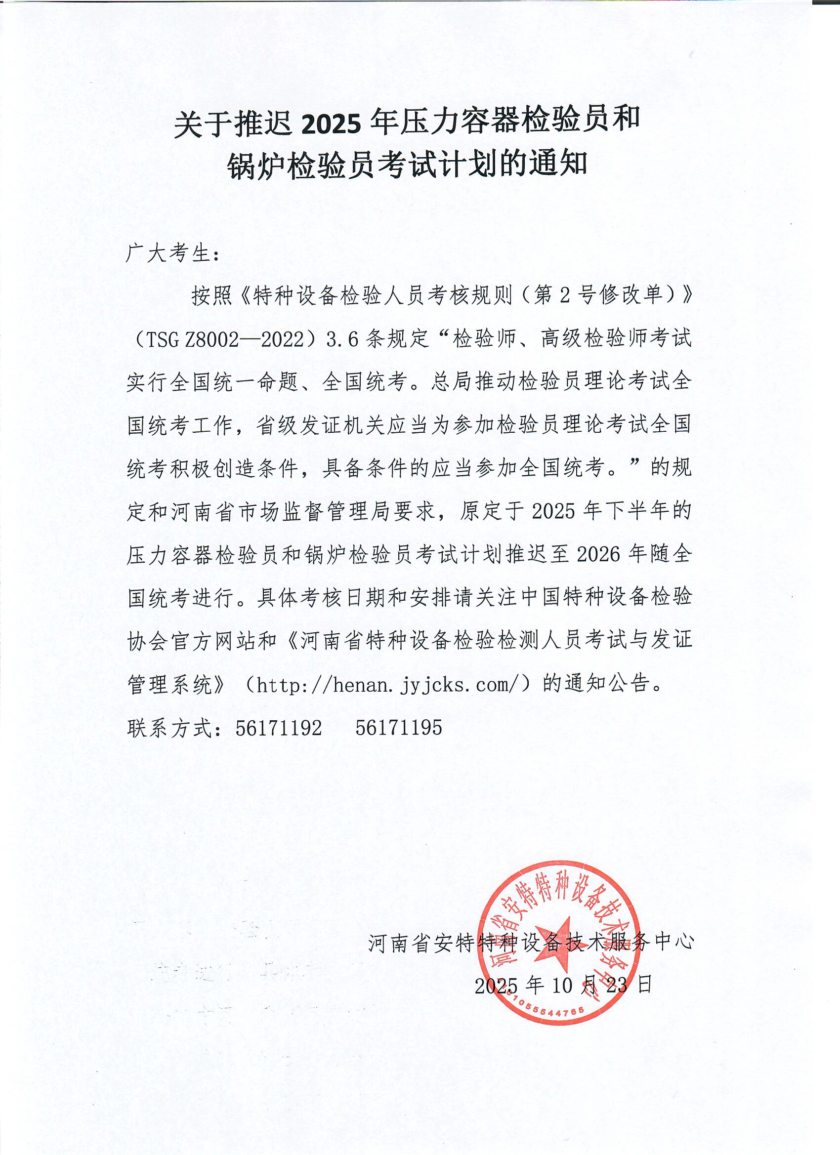 关于推迟2025年压力容器检验员和锅炉检验员考试计划的通知
